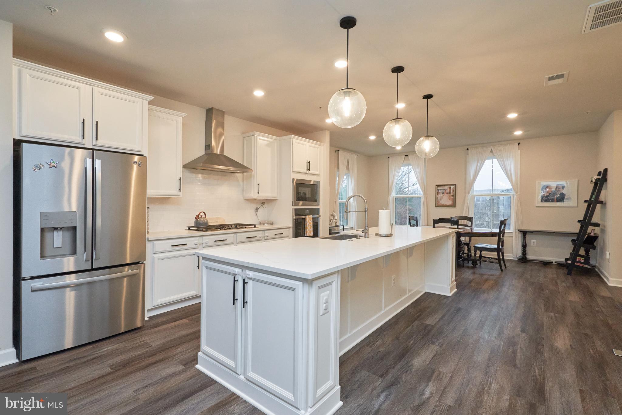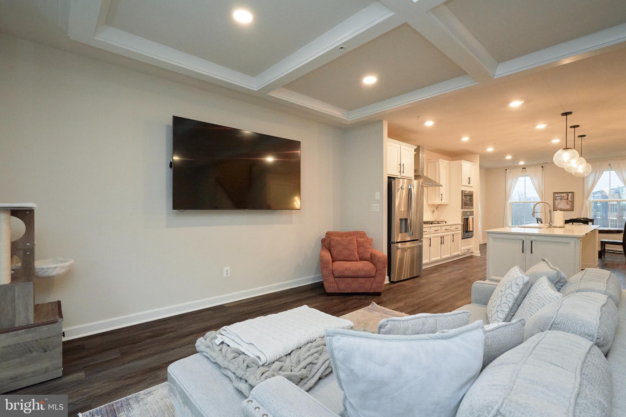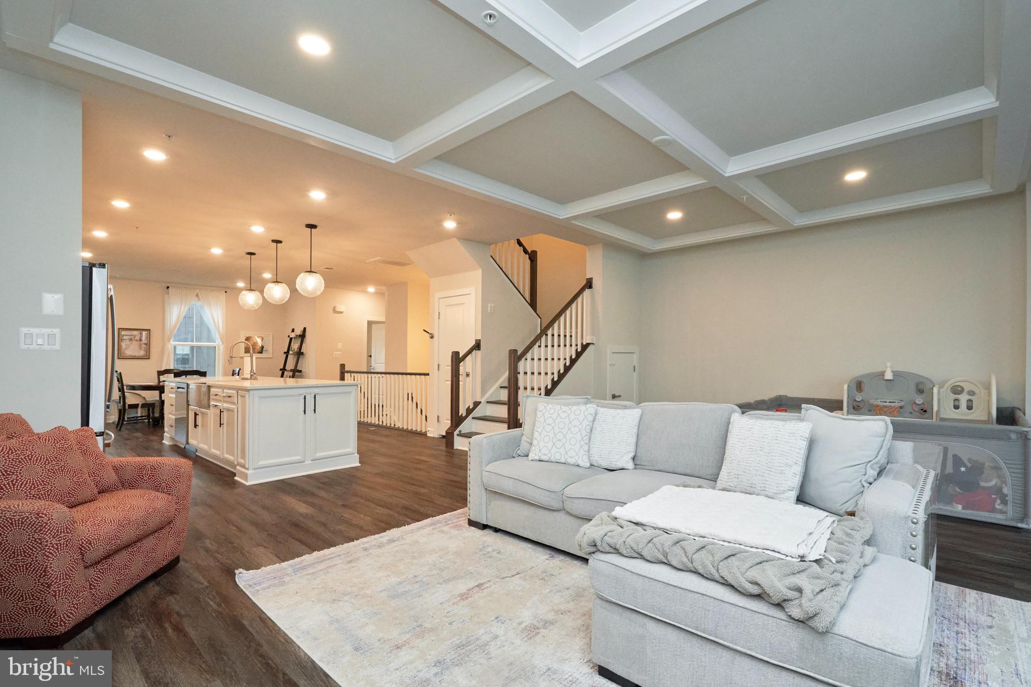 Step into the charm and comfort of Woodland Park! This thoughtfully designed home welcomes you with an open and airy main level, featuring wide-plank luxury flooring, abundant recessed lighting, and large windows that bathe the space in natural light. The gourmet kitchen is a chef's dream, showcasing sleek quartz countertops, a spacious central island, crisp white cabinetry, a stylish backsplash, and high-end stainless steel appliances--including a vented cooktop hood and a wall oven/microwave combo. The adjoining family room, with its elegant coffered ceiling, opens seamlessly to a fantastic balcony through glass doors, perfect for indoor-outdoor living.